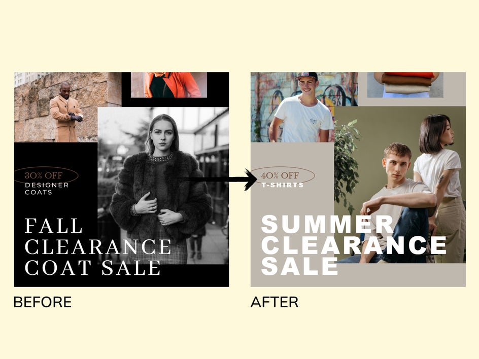 Got a flash sale, discount, or special offer? Sales templates make sure your message is loud and clear. Bold fonts, contrasting colors, and strong calls to action help your promotion stand out in crowded feeds. Use these templates to announce new product launches, seasonal sales, or limited offers. You can also use the Smart Resize tool to transform your post into a story or reel cover and keep your campaign cohesive across formats.