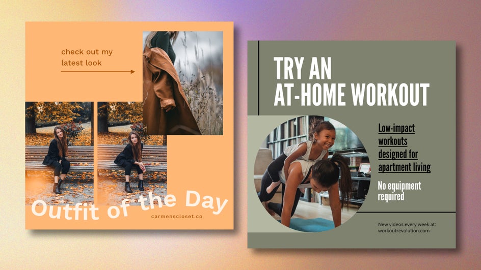 If you publish blog posts, YouTube videos, podcasts, or any other form of content, you can use BeFunky’s templates to bring your latest link to life. These layouts allow you to showcase a title, thumbnail, and key message that encourages followers to swipe up or navigate to your ink in bio. Try matching the post’s design to your blog’s branding or using carousel layouts to preview multiple points from a single article.
