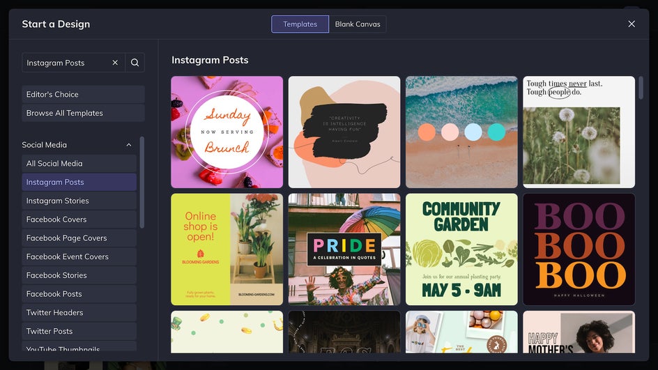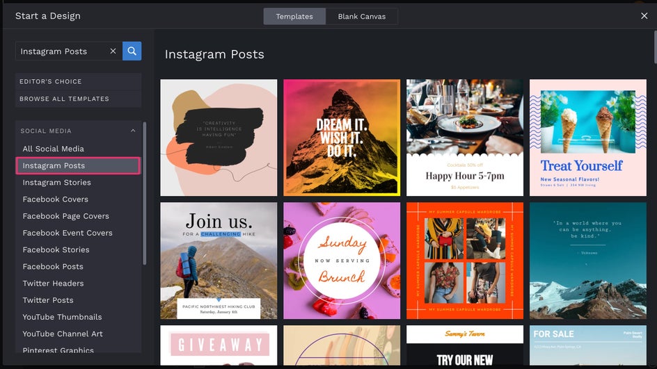 First, open up the Graphic Designer. Here you’ll find all of BeFunky’s social media and print templates. From here, navigate to the Social Media category in the sidebar, and then Instagram Posts. This curated library of eye-catching designs covers themes like sales, holidays, quotes, and more. Choose any template to start editing.