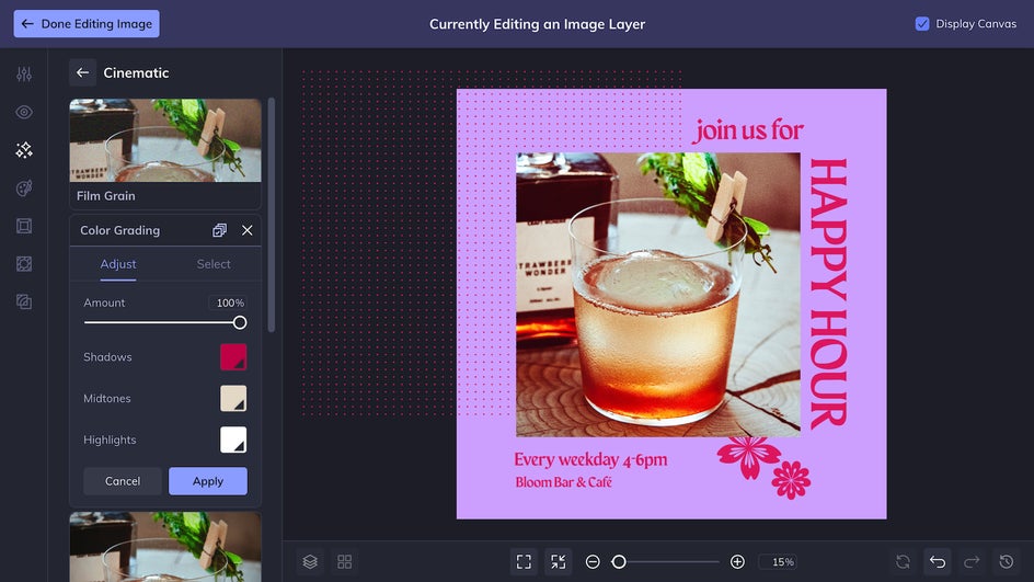 Here you can make quick adjustments to exposure, contrast, and color. You can also use one-click tools like the AI Image Enhancer, Background Remover, or Artsy Effects to transform your photo from ordinary to extraordinary. Here we’re using the Color Grading tool so that the image aligns better with our brand colors.