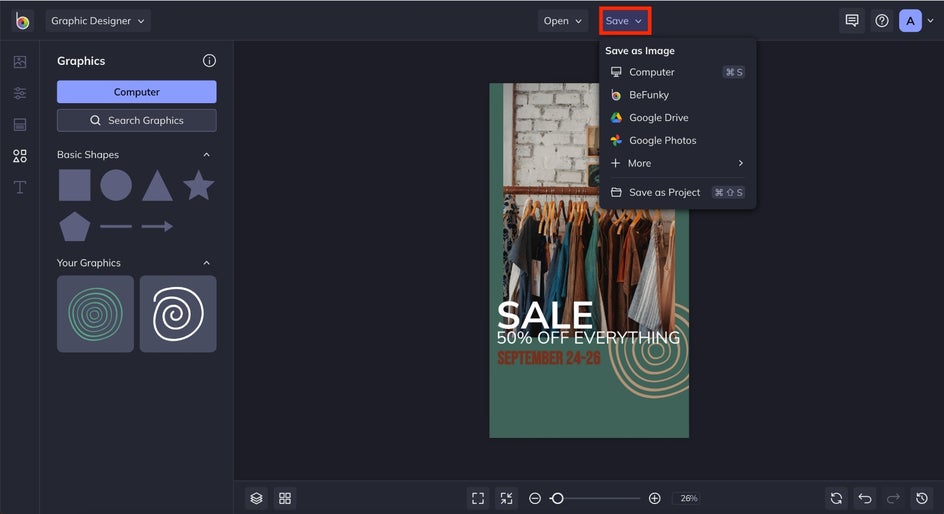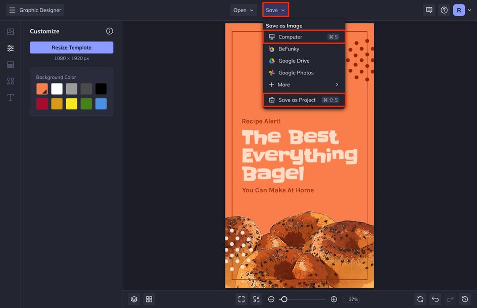 Finally, navigate to the Save dropdown menu at the top of your screen to save your design to your Computer as a high-quality JPEG. I also make sure to Save as Project so that I can come back to the design to edit it at a later date.