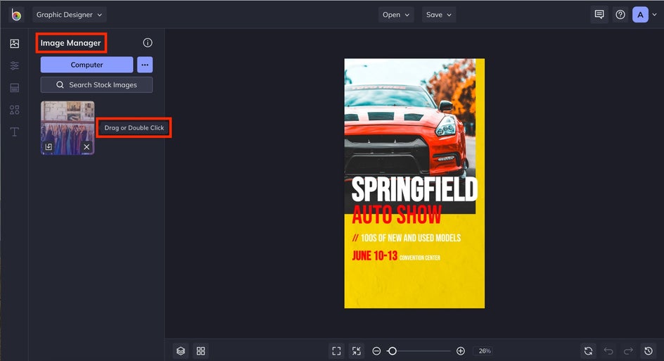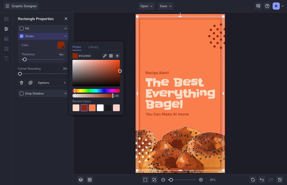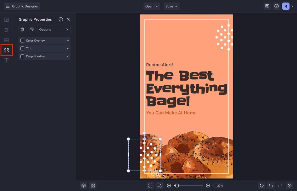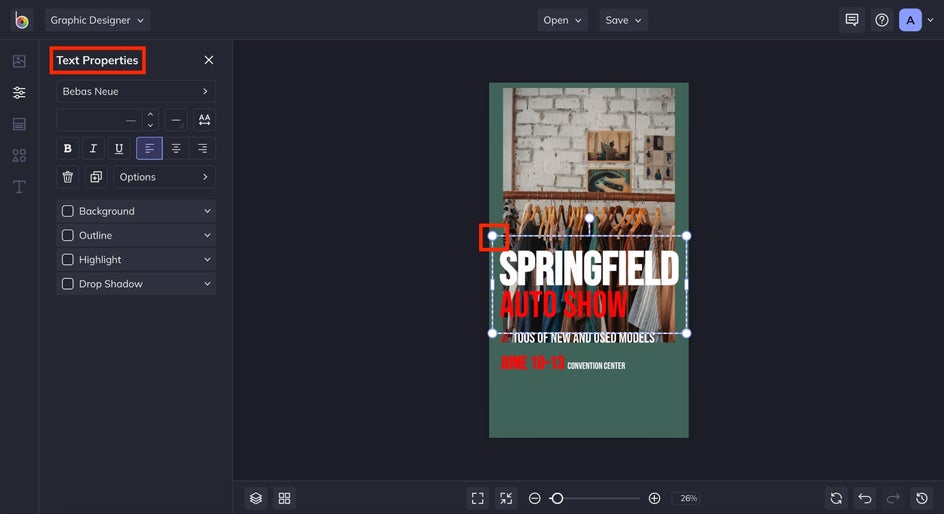 To further customize your graphics, click on them. From here a Graphics Property menu will appear where you can adjust the Color, Drop Shadow, and Orientation of the graphic. To adjust the size, select the graphic and drag the corners outward or inward. You can also rotate the object by selecting the central point and moving your cursor to the right or left.