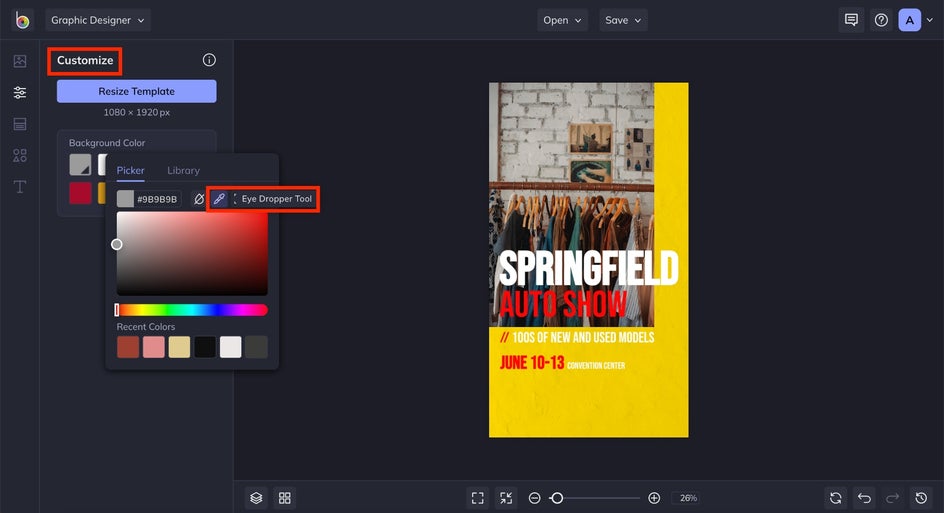 I always make sure that I fine-tune any of my color selections at the end so that the design meshes. First, I change the Background Color by selecting Customize in the left-hand menu. Select the first swatch to select your custom background color.