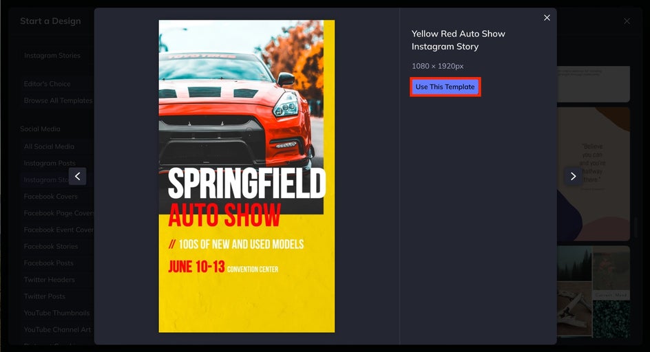 To create your own custom Instagram Reel cover, start by opening the Designer and selecting Templates or Blank Canvas. We are going to start from a Template. From here, select Instagram Stories and choose a template that suits your design vision. We are choosing this option because it matches the 9:16 ratio (1080x1920 px) we want to start with. Once you select a Template that you like, click Use This Template to begin.