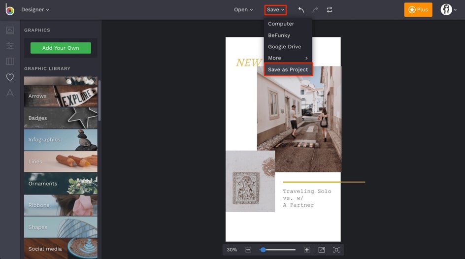 Once you’ve finished designing your Story, save it as a JPG or PNG file, so it’s in a compatible format for uploading to Instagram. We also recommend saving your custom Instagram Story template as an editable BeFunky file that you can edit any time you want to reuse it. To do this, click Save, then select Save as Project and BFD.
