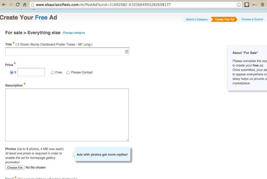 First log in to http://www.ebayclassifieds.com if you’re creating a classified ad in US or http://www.kijiji.ca/ if you’re selling something in Canada. Select “post ad free” or “create your ad” on the US interface. (Please note that the setup of the US interface means that you have to select your location first).