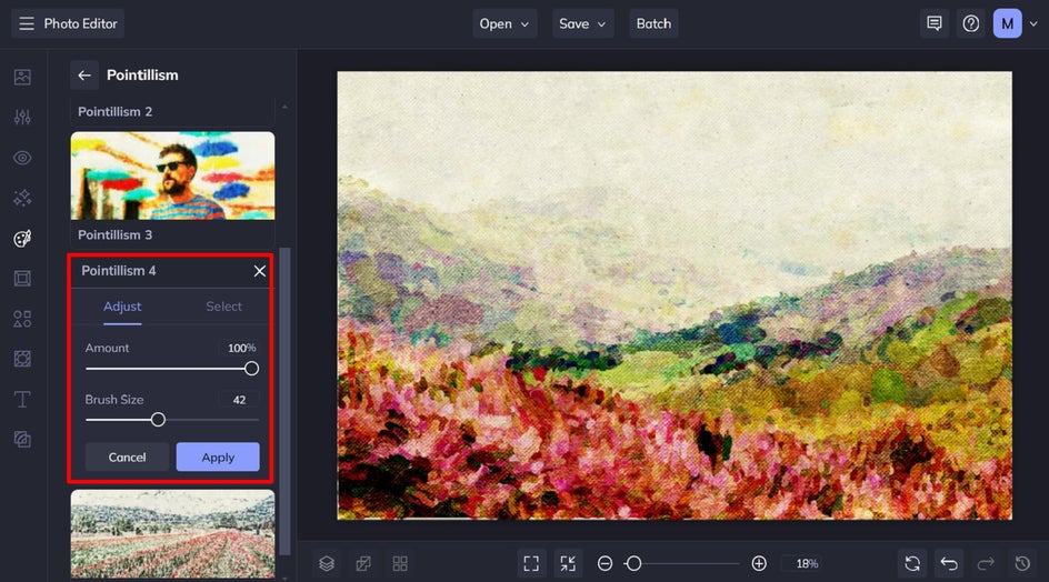 For the Pointillism 4 effect, you can adjust the brush size and amount.