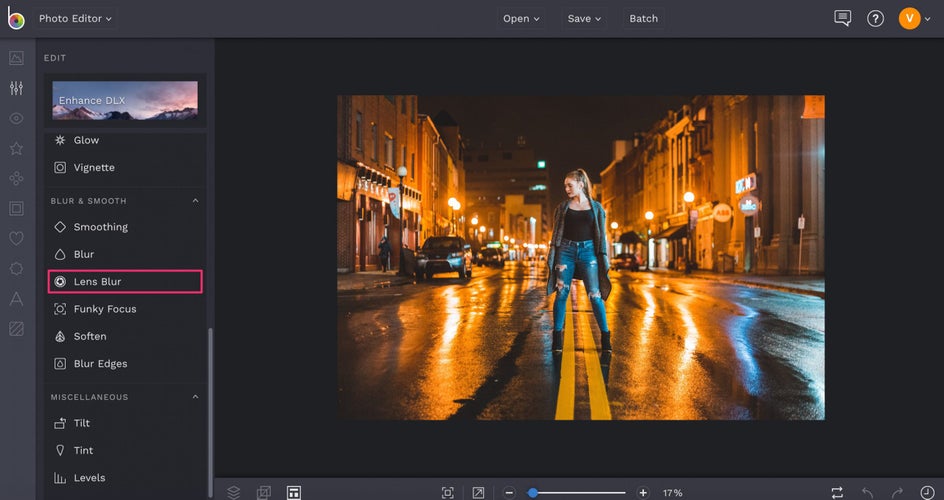 Once you have opened your image locate the Edit tab on the left side of your canvas, and select Lens Blur. It is found under the Blur and Smooth section. Click on it, and it will apply the tool to your entire image. This can be a little shocking at first, but the next few steps will help you create the perfect image.