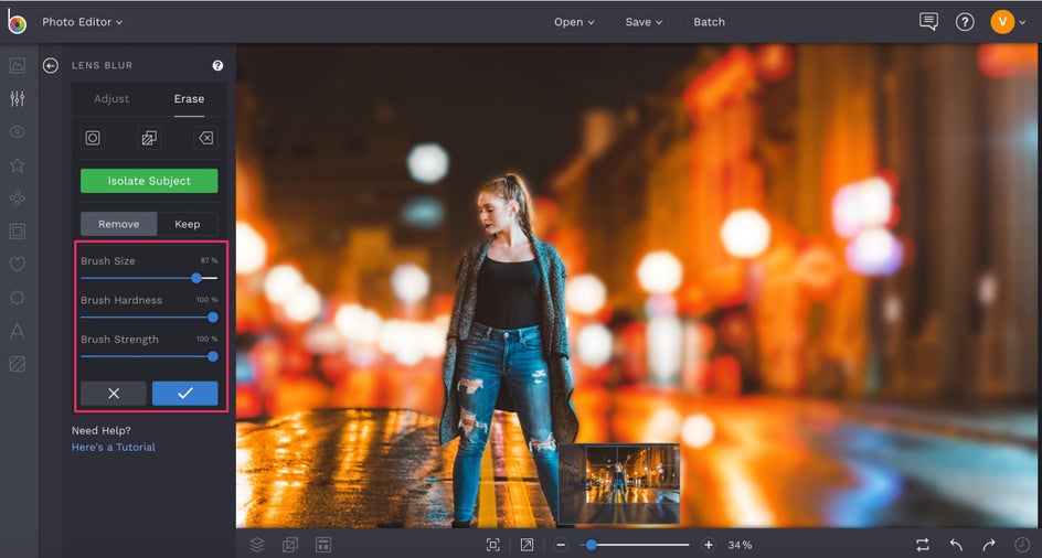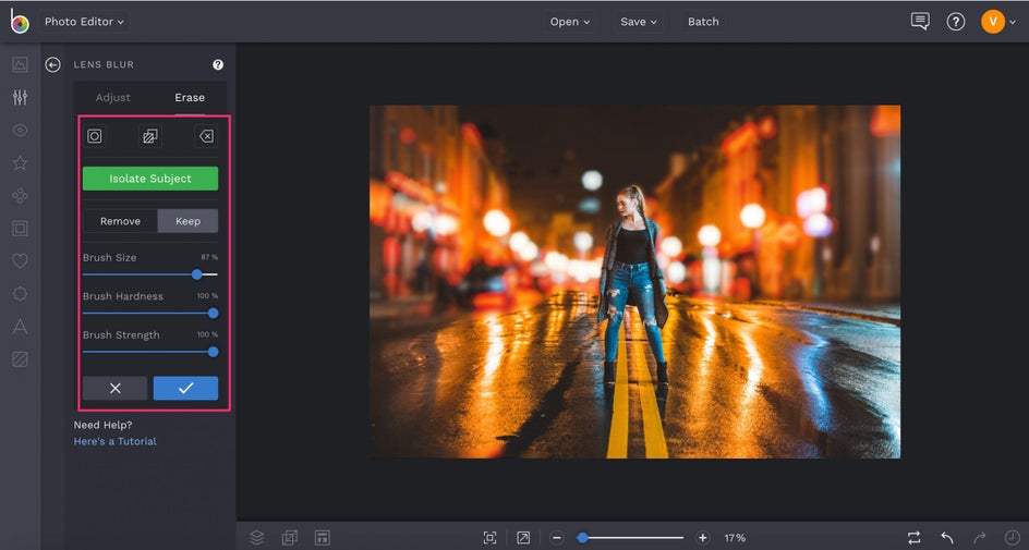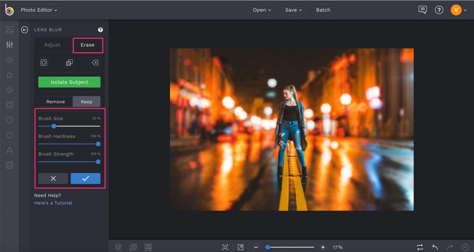 Like we did in the tutorial, anywhere with light in the background can make an excellent bokeh effect. Simply click the Erase tab, and select the Isolate Subject button, this will use AI technology to isolate the main subject in your photo so that the blur isn’t affecting them. If it isn’t quite perfect, you can use the Remove and Keep options to fine-tune your image.