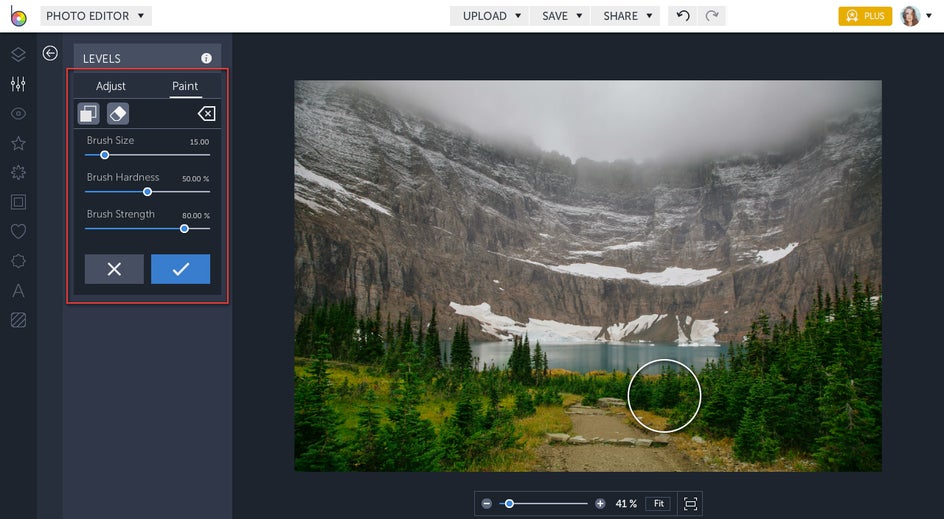 You can also only use the Levels tool on the parts of your photo that need it. To do this, click on the Select tab located next to Adjust. Then, select whether you want to Remove or Keep the selection. You can also modify your Brush Size, Brush Hardness, and Brush Strength using their corresponding sliders. Then, use your cursor to apply (or remove) the effect.