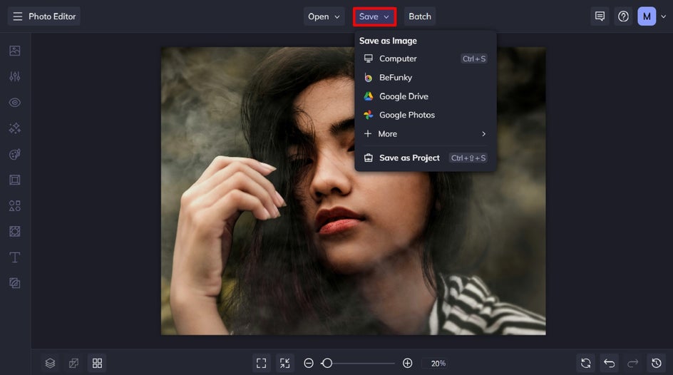 You can either continue editing your photo using BeFunky’s other editing tools and photo effects, or if you’re ready to save your photo, click Save at the top of the screen. Then, select your desired save location.