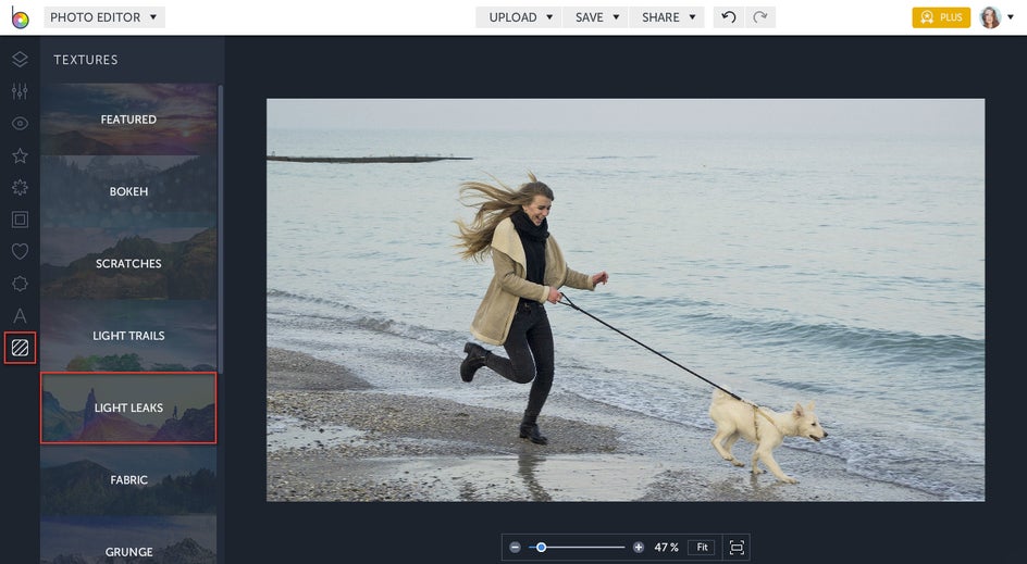 Navigate to Textures in the main menu on the left, then click Light Leaks. BeFunky currently has one free light leak that you can use in any photo you desire. However, to access our full light leak packs, you’ll need to upgrade to a Plus account.