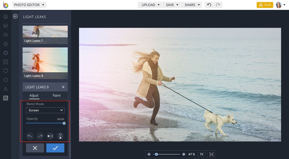 By clicking on the Settings button within your chosen texture, you’ll be given a wider array of options to customize your light leak. In the Adjust toolbar, you can choose between different Blend Modes, as well as the Opacity levels. You can even rearrange the position of your light leak by clicking on the left or right arrows, or flip them vertically or horizontally.