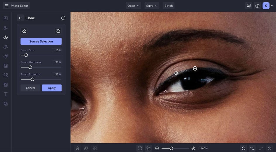 - Clone to remove stray hairs, lint, and touch up your makeup.