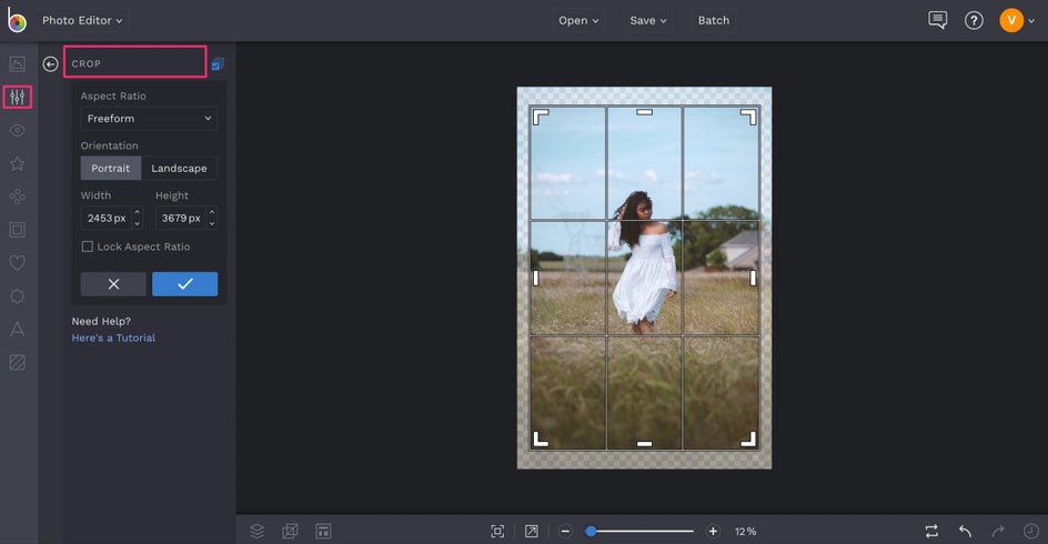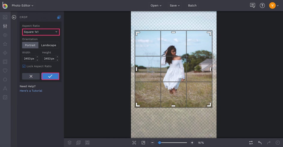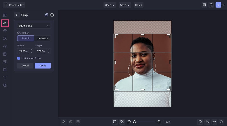 First, let's make sure our portrait is cropped to the correct dimensions. Head to the Edit tab and use the Crop tool to make sure it follows LinkedIn’s recommended 1:1 ratio – ideally 400 x 400 pixels.