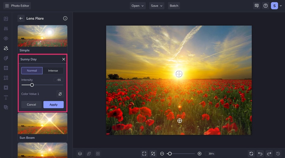 Sunset photography is all about mood. The colors are rich, the lighting is soft, and there’s often a strong emotional connection to the scene. But cameras don’t always capture the full spectrum of light the way we see it with our eyes. Lens flare helps recreate the golden glow that wraps around everything during sunset, highlight the direction of the light to make the image feel more immersive, and add a sense of drama or romance depending on how stylized the effect is. It can also help you emphasize silhouettes and long shadows, adding extra depth and storytelling. With BeFunky, you don’t need special equipment or complex software to make it happen — just a few clicks in the Photo Editor.