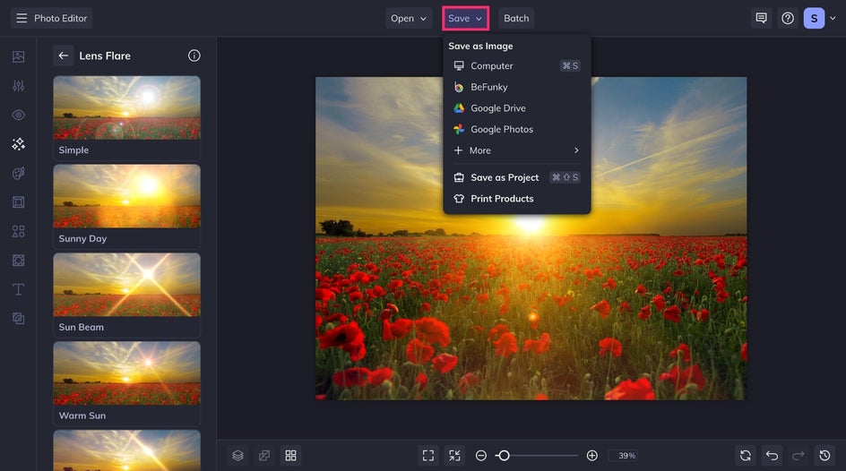 When your sunset looks just right, click Save at the top of your canvas. You can choose to save it to your computer, BeFunky account, or connected cloud storage – perfect for printing or posting right to social media.