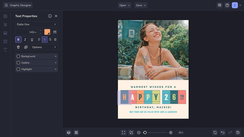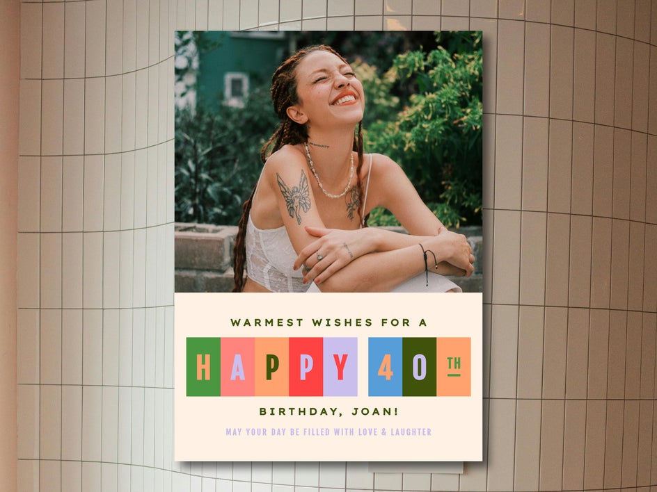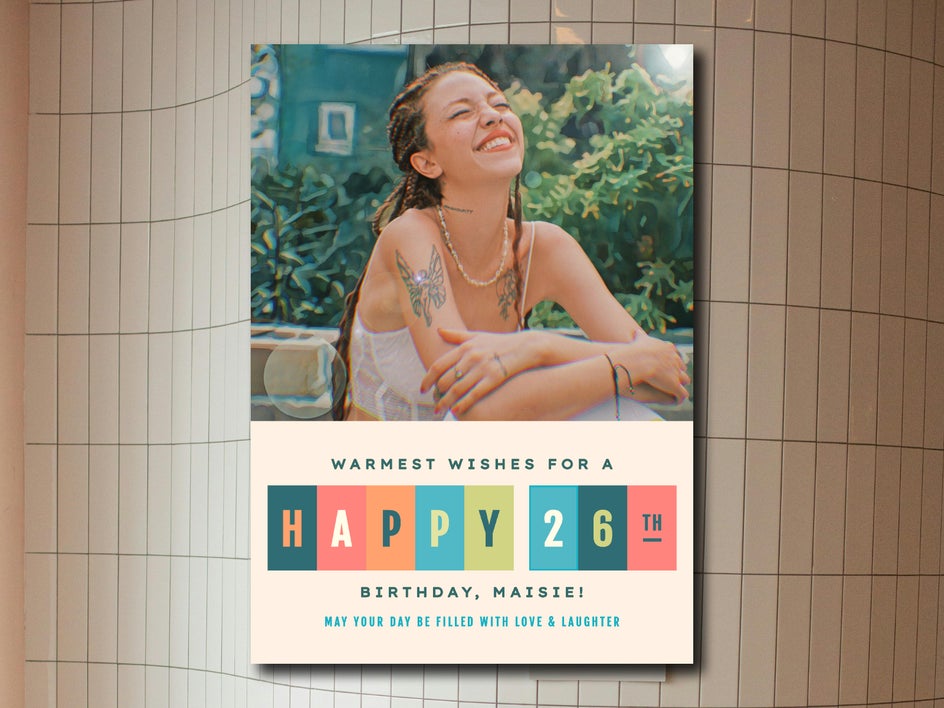 And there you have it! A personalized birthday card that you can create online or from your phone in just a few minutes. The edits and effects used for the photo, as well as small changes made to the color palette, have softened the bold template while still infusing the card with lightness and vibrancy. It’s the perfect card to match our recipient’s personality!