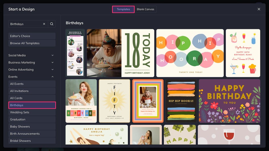 In the Card Maker, you’ll have a large selection of card templates to choose from. These are organized by topic for easy browsing. Here we can navigate to Birthdays and choose a free birthday card template from there.