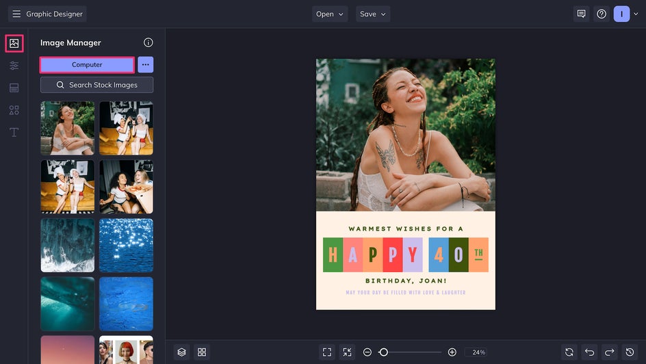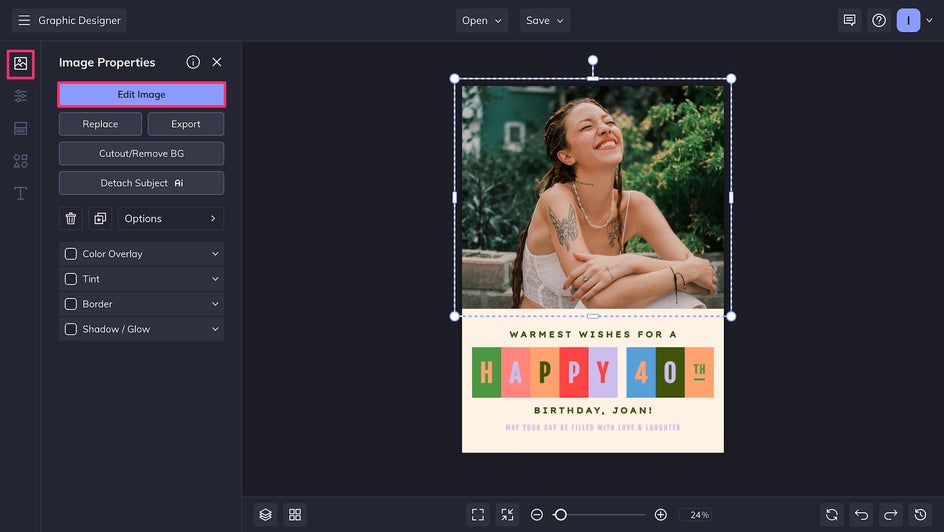 Editing photos in-platform is particularly useful when your card features one or two prominent photos. In this tutorial, we’ll be creating a birthday card that celebrates the recipient with a portrait. Basic edits will help refine the original photo, while combining a few of the Photo Editor’s effects will make the portrait completely unique. To get started, just open up the Card Maker.