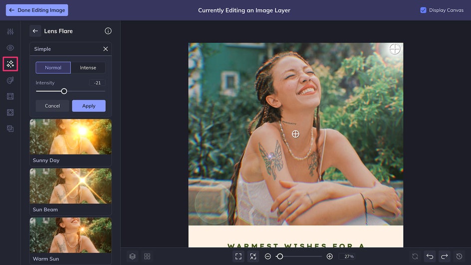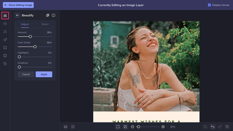 The Photo Editor features a full suite of photo editing tools, filters, and effects. A good place to start is adjusting basics like Color or Exposure, where you can adjust the brightness, contrast, shadows and highlights to bring balance to your image. Alternatively (or additionally), you can use tools like the Image Enhancer or Beautify to instantly enhance your photo using carefully crafted algorithms.