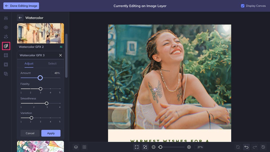 The image is looking great already, but an Artsy effect can help put it over the top. Use a filter like Watercolor GFX 3 to create a hand-painted background like we’ve done here, or apply an Artsy effect to the whole image. There are tons of different options to choose from – you can turn your photo into a pencil sketch, a comic book panel, an oil painting, or a piece of video game art, to name a few – so don’t be afraid to explore your options.
