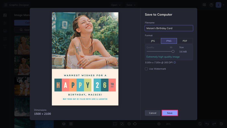 Once you’re done, just click Save at the top of the page. If you’re planning to print this card physically, be sure to save as a print-quality PDF; otherwise, a high-quality PNG works for most digital needs like emailing, messaging, or posting to social media.