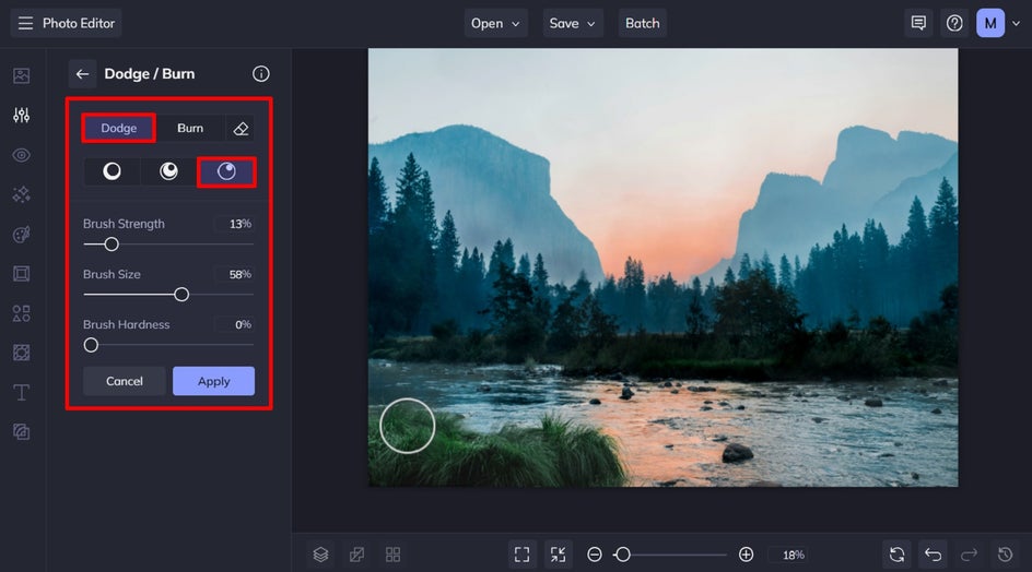 Now, we’re going to use the Dodge tool to brighten any underexposed areas of our landscape photo. Repeat the process above, concentrating on the parts that need lightening.