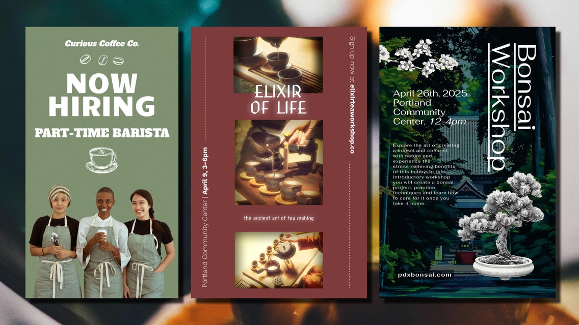 With the Poster Maker, you can easily produce vibrant event posters to announce concerts, workshops, fundraisers, and other events. Add creative flair with the Photo Editor’s painting effects, glitch effects, lens flares, and more. If you’re a small business owner, you can use the Photo Editor’s AI Image Enhancer right within the Poster Maker to enhance posters for sales promotions, new product announcements, and seasonal specials. Use the Background Remover to elevate posters for workshops and classes, or polish your hiring posters with Touch Up tools. Whatever your creative vision, the combined powers of the Poster Maker and Photo Editor will help you bring it to life.
