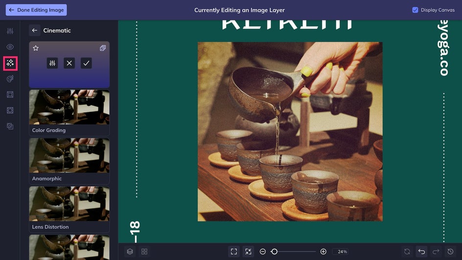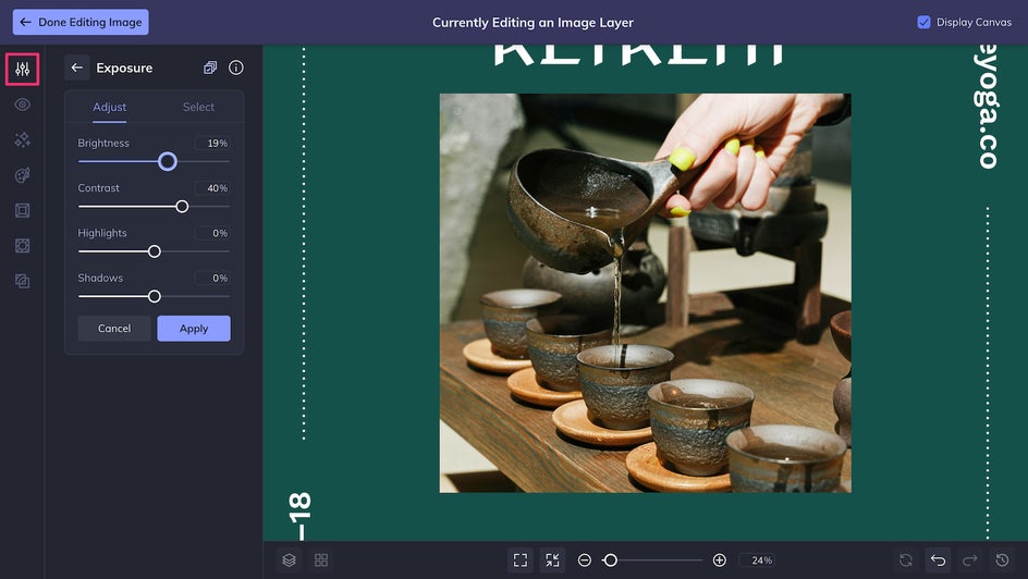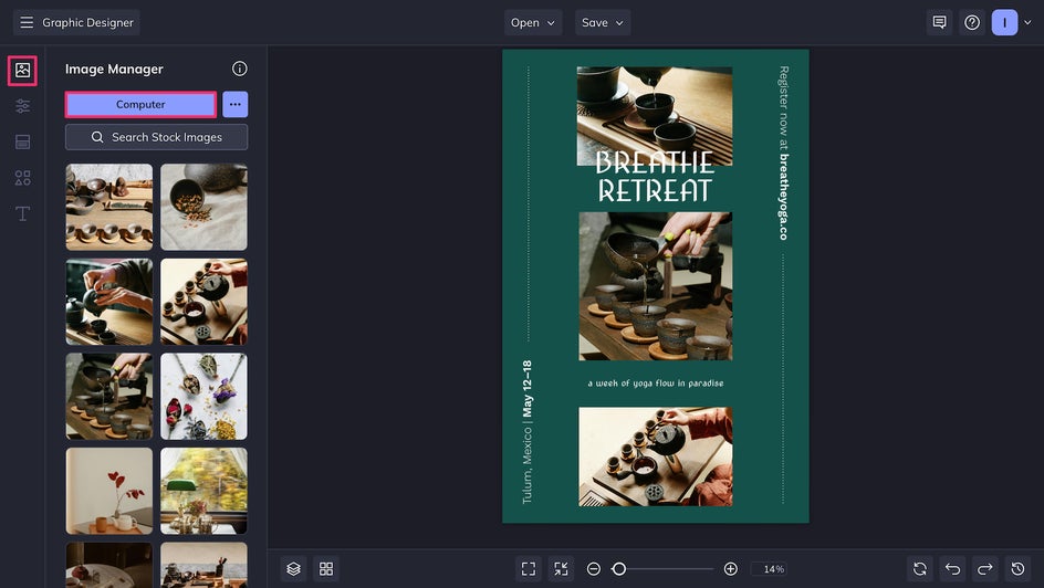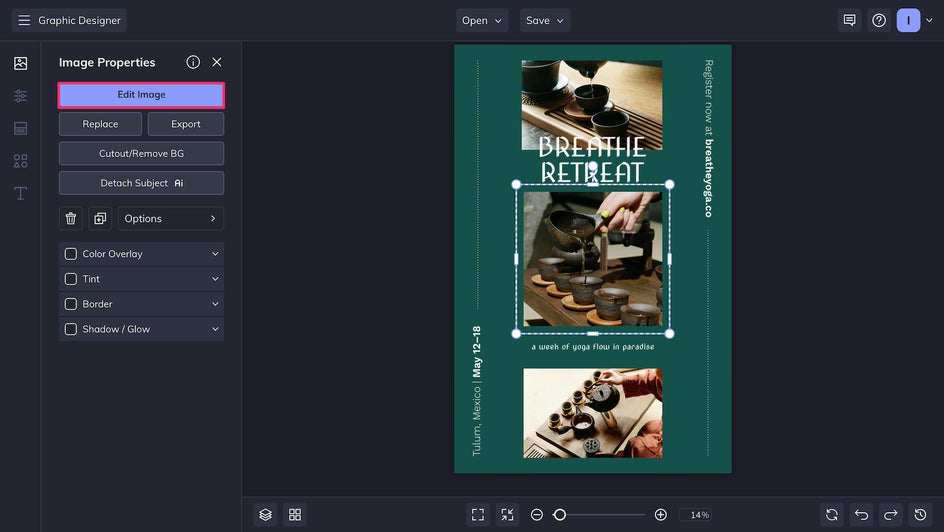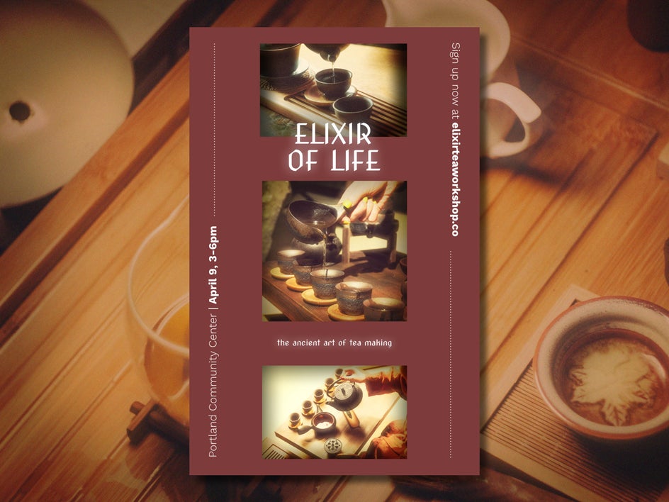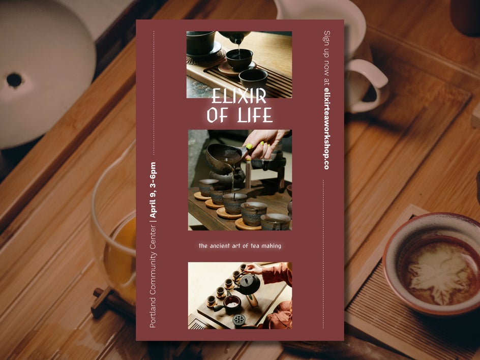 Once you've selected your ideal template from Poster Maker, fine-tuning your poster’s imagery with BeFunky's Photo Editor can dramatically enhance your final design. With the Poster Maker, you can also make as many or as few adjustments to the existing template as you’d like. Here we’ll walk through the process step-by-step, using a poster for a tea workshop as an example.