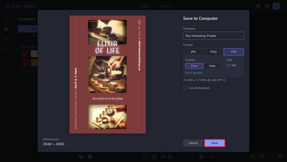 Click Save at the top of the page to save your design for printing. All poster templates are already in a standard letter size, but make sure to save your file as a print-quality PDF for the best possible print results.