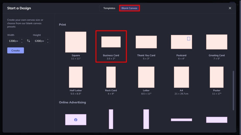 Scroll down to find the Business Card (3.5” x 2”) sized template, located in the Print section.