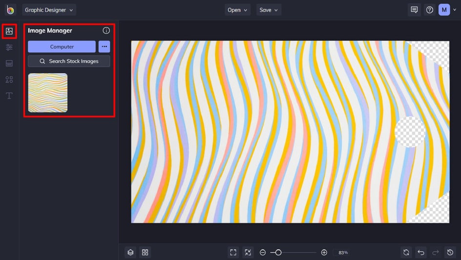 Now comes the fun part: adding a unique design to your luggage tag business card! Navigate to Image Manager in the main menu on the left. From here, you have the choice of using one of your own images on your luggage tag, or one of the millions of free stock photos available in BeFunky’s Stock Image Library.