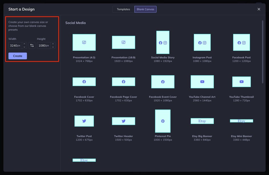 To do this, select the Blank Canvas tab. In the left-hand menu, set the height to 1080px. For the width, multiply the number of slides you want with 1080. For us, it would be 3x1080, which equals 3240. Our dimensions for this will be 1080x3240.
