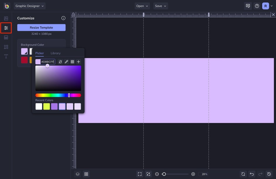 Choose a color palette that you want to start with. This can change as your design grows. We will be using purple. In the Customize tab, select the first square and choose a color from the menu that appears.