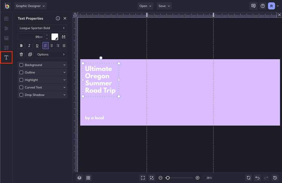 To add text, select Text from the left-hand menu. Type in your title and then with the text box selected, you can adjust the Font, Size, and more in the Text Properties menu that appears.