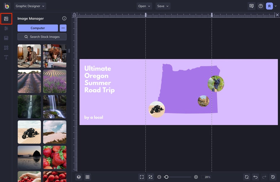 You can plug photos into graphic elements with the Masking feature. We are going to add circle graphics that we will add photos to first. If you want to follow our design and add photos to your graphic element, click the Image Manager left-hand tab. Here, you can upload your photos or choose from thousands of images by selecting Search Stock Images.