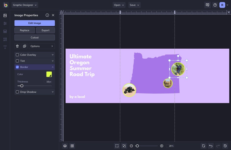 To add the photo to your circle element, simply drag your image over the element until you see it highlight blue and then release your mouse. The image will be automatically added. To adjust the crop and size, simply double-click into the element to manipulate the image. With your elements selected, you can change the Image Properties in the menu that appears. We will add an outline to make the images stand out.