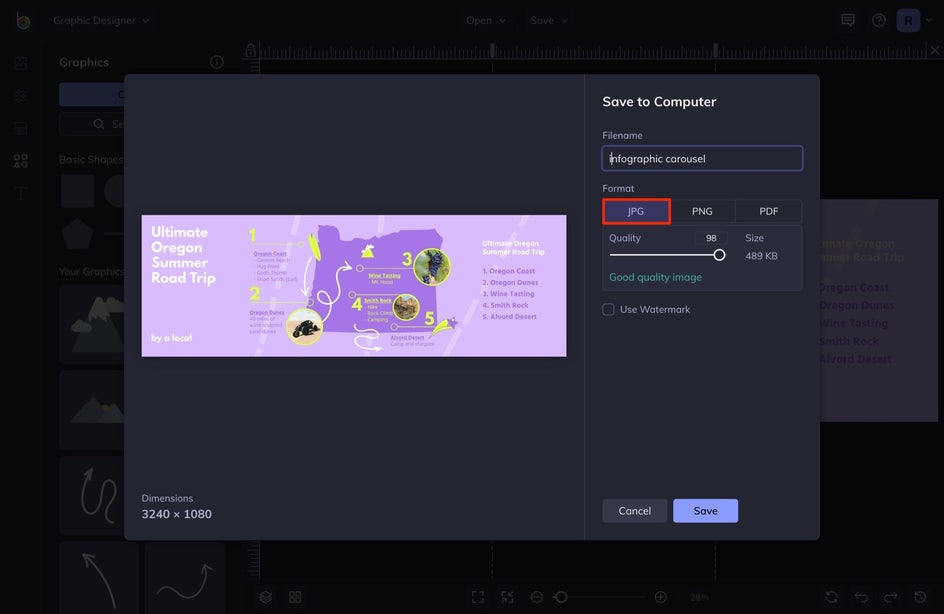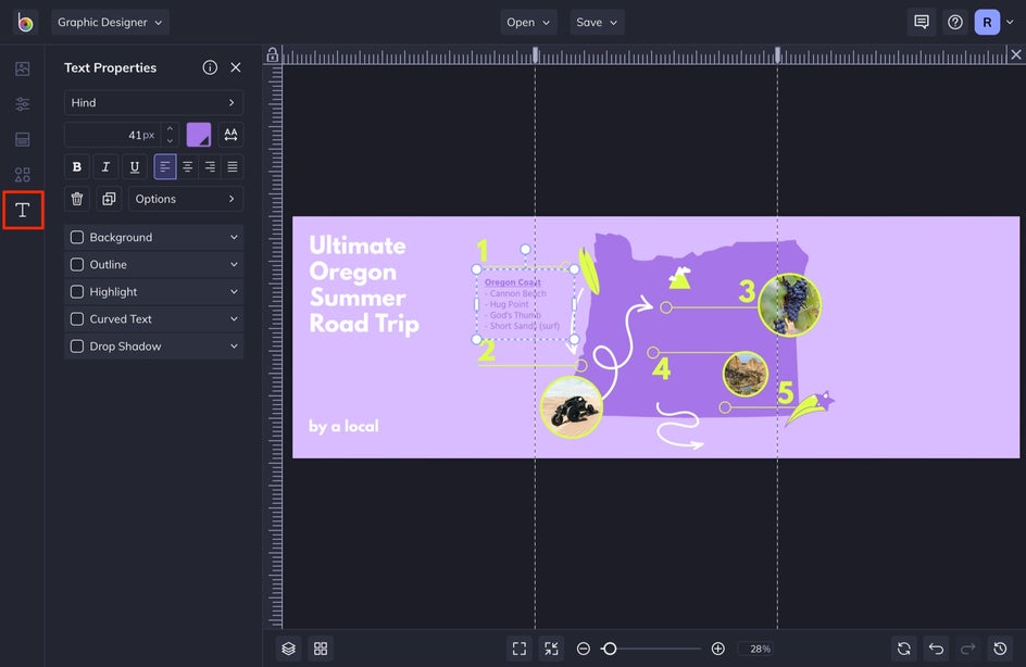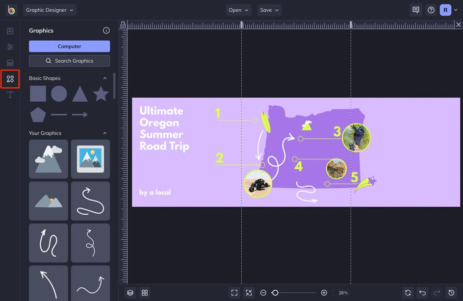 Carousel graphics should be inspirational, shareable, and visually appealing. Some of the best graphics here are typographic quotes or even sharing useful content, like sharing favorite spots you visited on a recent trip you took. If this was something that you were thinking of sharing, how would you go about creating a graphic to share your trip tips? Infographics are a great piece of sharable, visually appealing content. With BeFunky’s Graphic Designer, you can create one in no time.