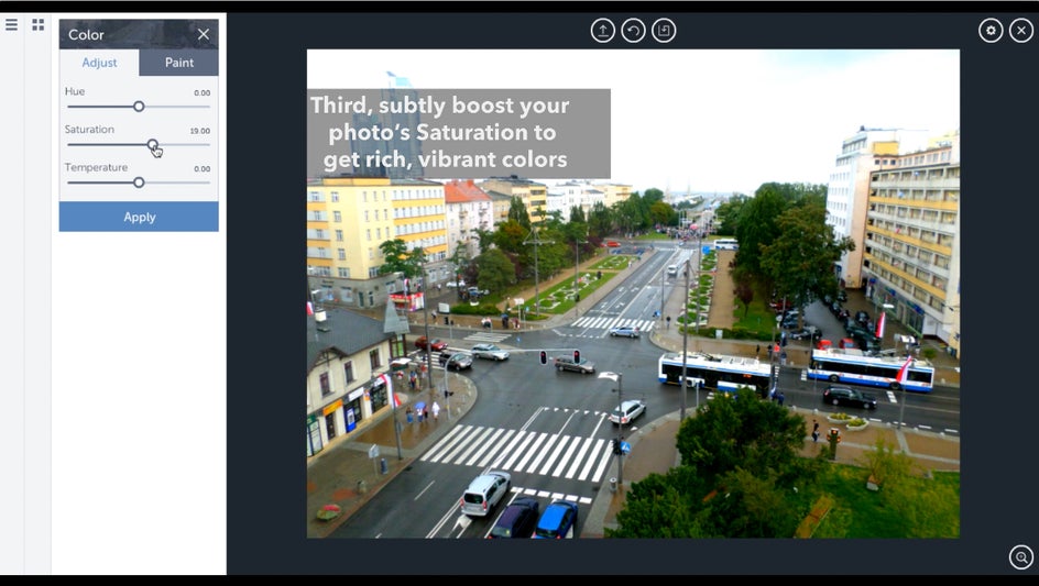Subtly boost your photo’s Saturation to get rich, vibrant colors. By enhancing the saturation you'll help to trick the eye and improve the miniature effect.