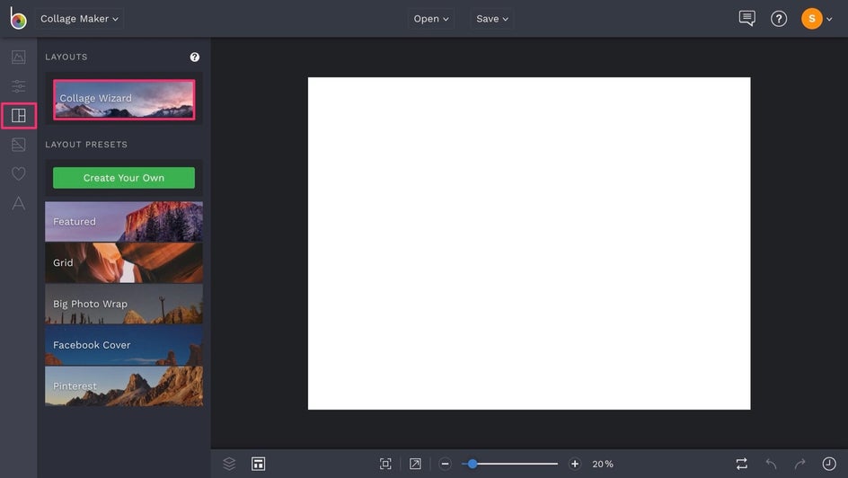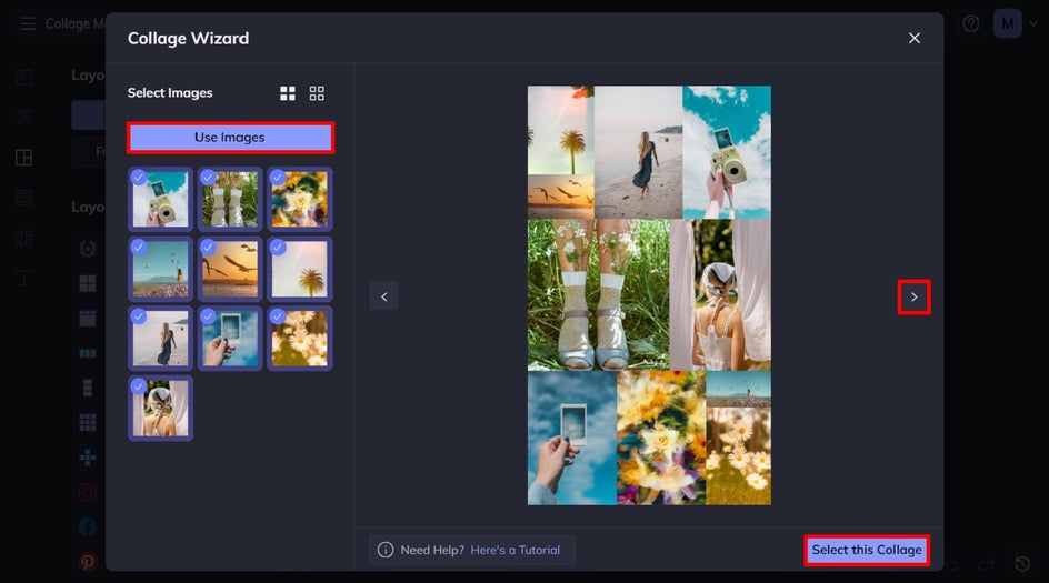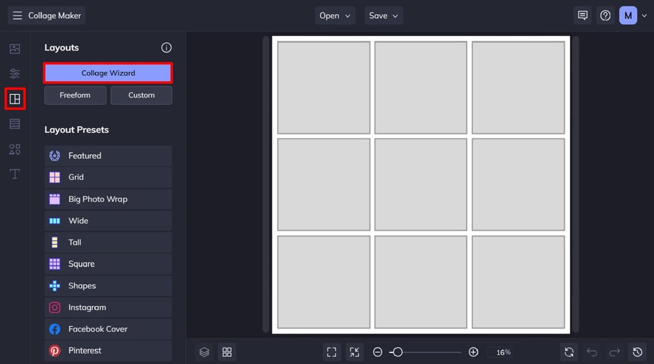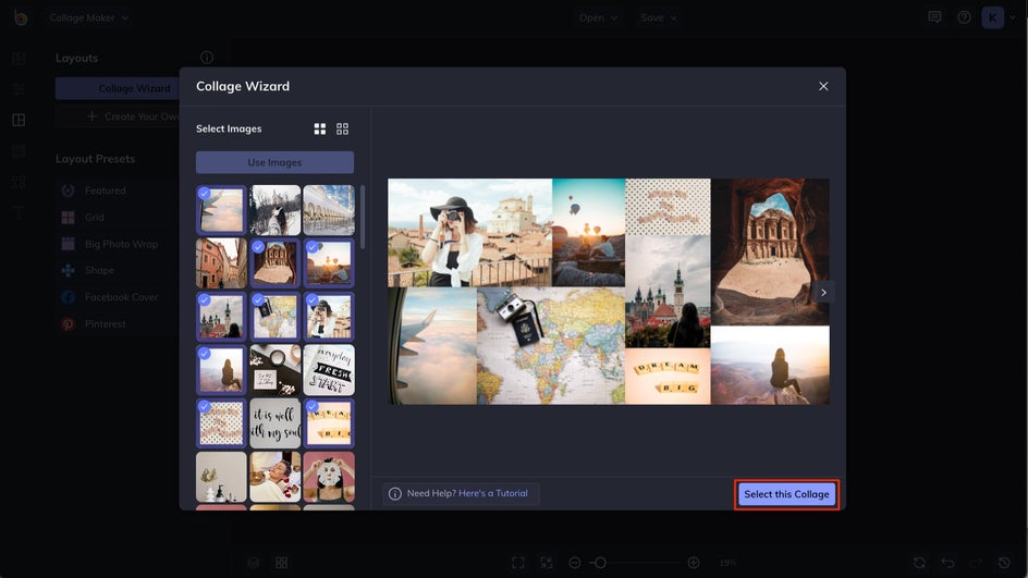With your images ready, head to the Layouts tab. One of the easiest ways to build your monthly vision board is with the Collage Wizard, as it takes the guesswork out of arranging your photos.