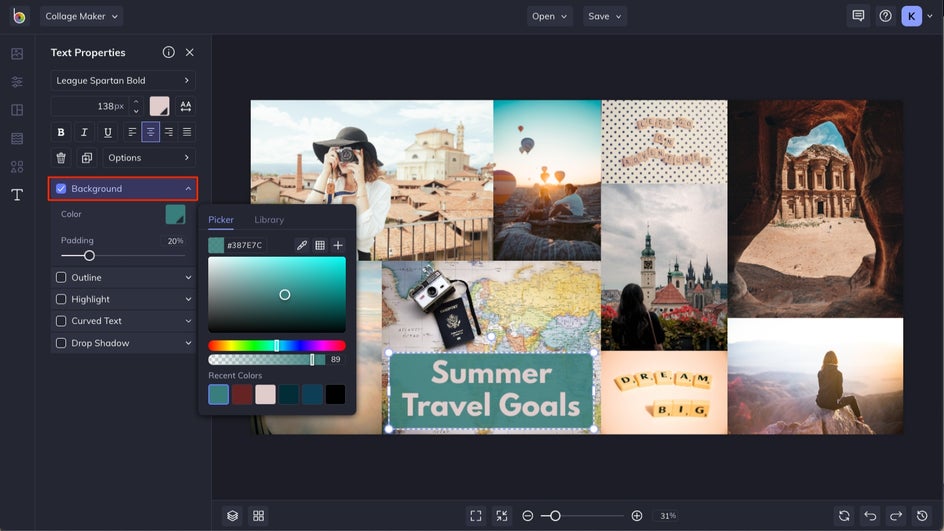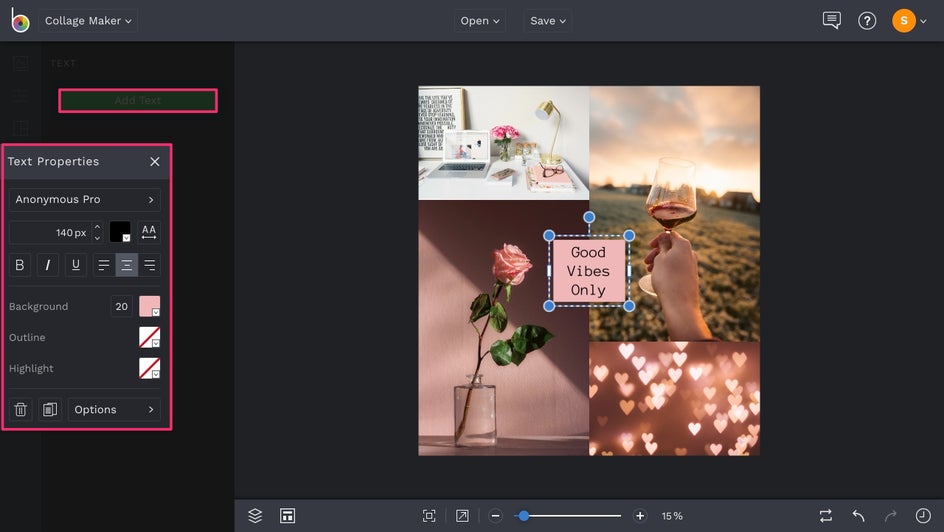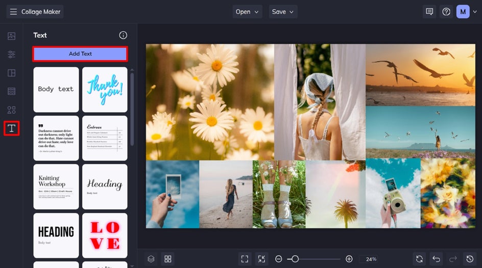Text can help bring your vision board to life by adding quotes, goals, power words, or monthly intentions. To add text to your collage project, navigate to the Text tab.