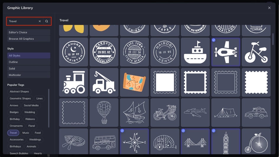 Click the Graphics tab, followed by Search Graphics. Select any graphics you wish to use in your vision board design, then exit the library. These graphics will now be located in the Your Graphics section.