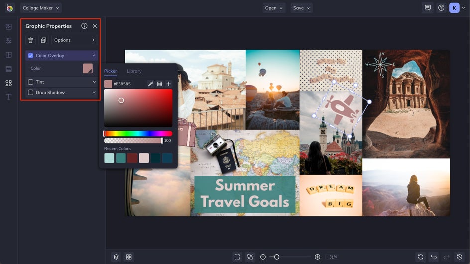 Drag your chosen graphics onto the canvas, then use the Graphic Properties menu to customize their colors or add other effects to make them pop.