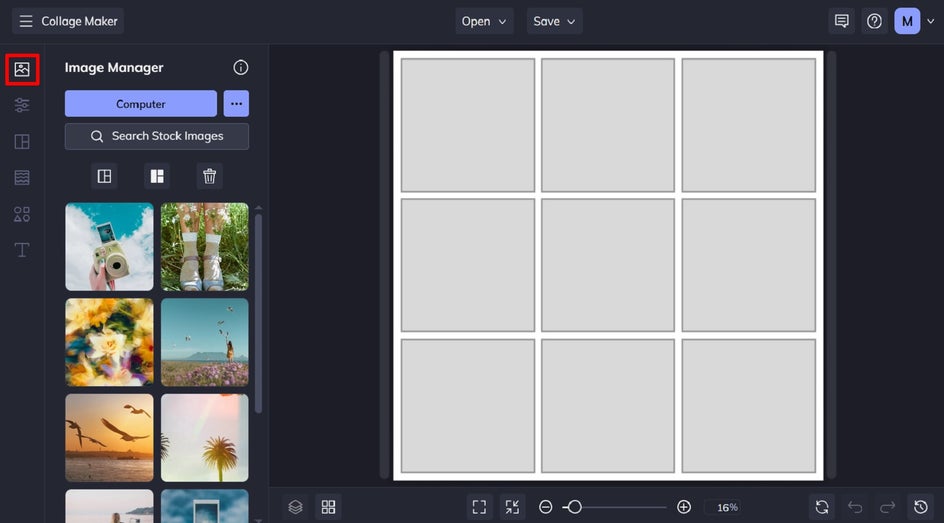 Start in the Image Manager tab. From here, you can upload images from your computer. Or, search for inspirational images using our free Stock Image Library.