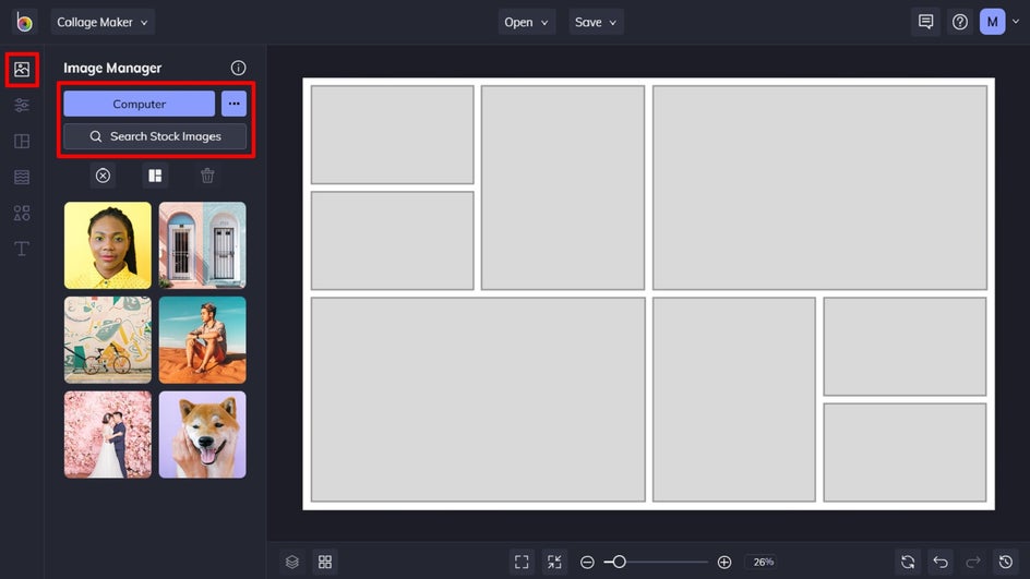 Navigate to Image Manager from the main menu on the left (it’s the first symbol). From here, you can upload your chosen photos from your computer, as well as your BeFunky account, Facebook, or Google Photos.