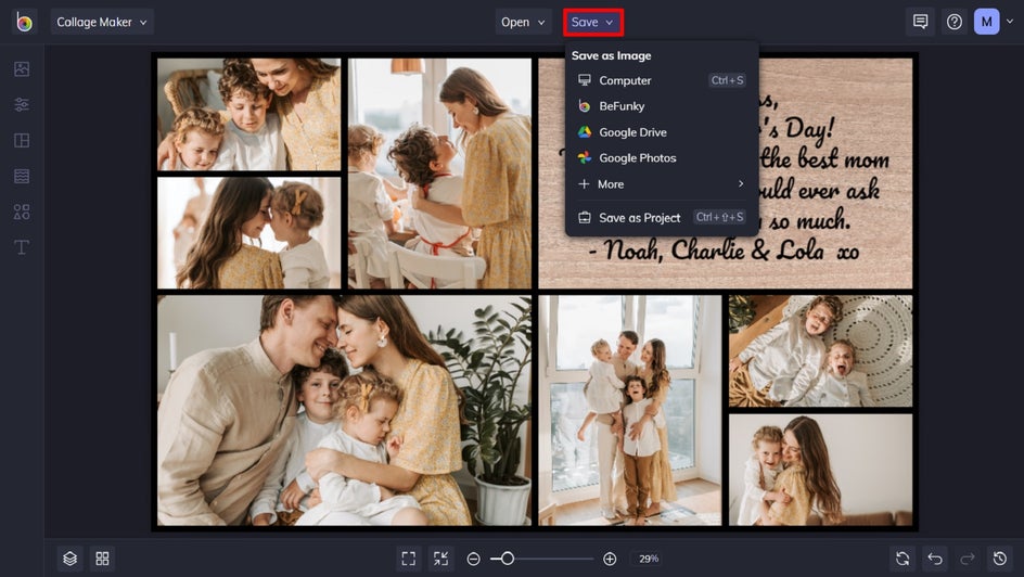 Once you’re happy with how your Mother’s Day collage looks, it’s time to save it. Simply click Save at the top of the screen, then select your desired save location.