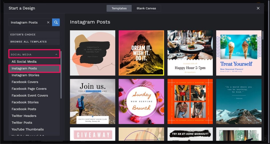 Within the Templates Library, you can type Instagram Post into the search bar in the top left, or navigate to Social Media > Instagram Posts.