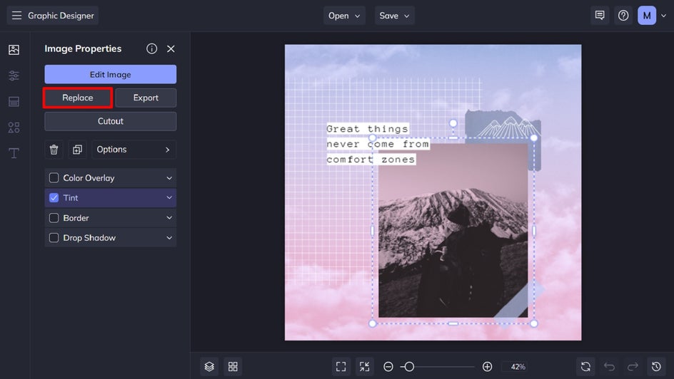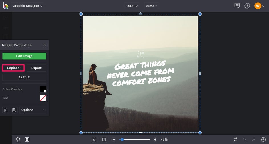 Firstly, you’ll want to swap out the template’s existing image for one of your own, or one more suited to your Instagram aesthetic. To do this, just click on the image, then from the Image Properties toolbar that appears, click Replace. This will allow you to locate an image file from your computer.