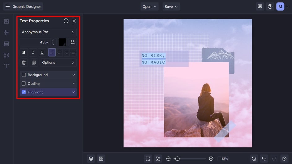 You’ll also notice that when you click on any text box, a Text Properties toolbar appears. From here, you can change things such as the font, text size, text color, spacing, and more.
